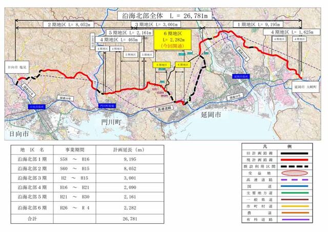 日向市塩見町から延岡市伊形町まで約19kmの区間と延岡市小野町から延岡市須佐町までの約13kmの区間に分かれていて、その間は県道49号で約6km程度でそれを含め全線約38km。